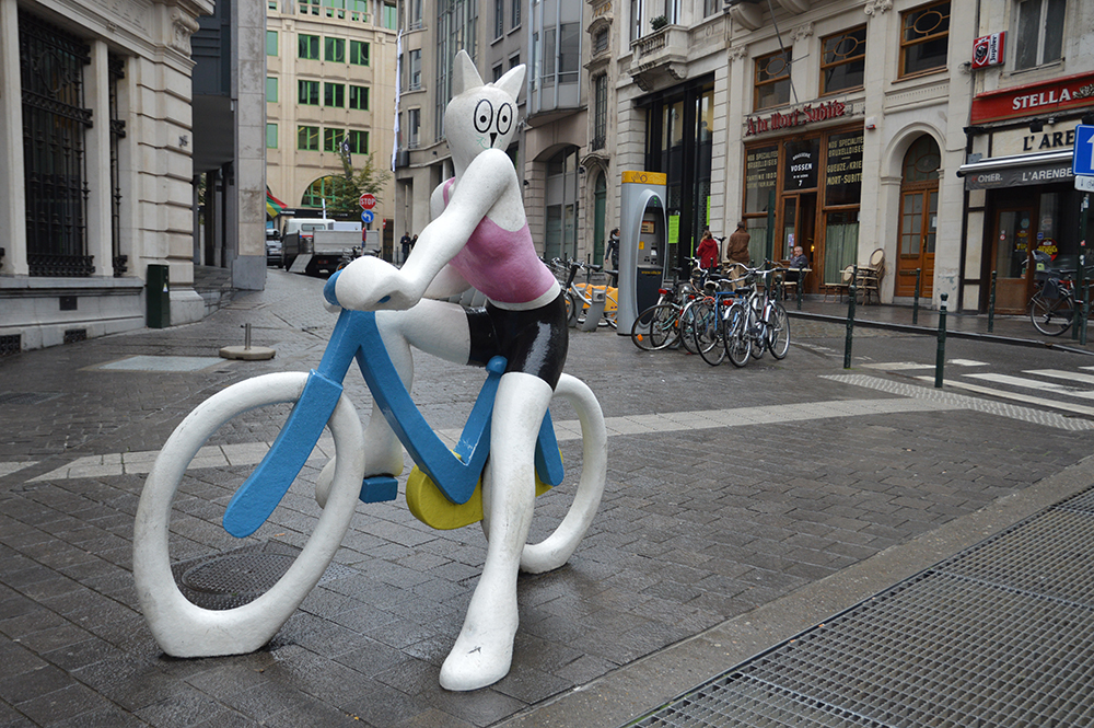 Rimpinzatici per bene siamo finalmente pronti per il nostro tour della città! Per prima cosa, da buoni nerd, non poteva mancare una capatina al Centre belge de la bande dessinée, le cui statue promozionali rallegrano tutta Bruxelles. Il fumetto è qui parecchio sentito, avendo dato la natalità a parecchi disegnatori, a partire da Peyo, il padre dei Puffi per finire con Hergé, creatore de “Le avventure di Tintin”, e il Centro offre un’esposizione permanente di tavole originali, e un’enorme sala lettura.