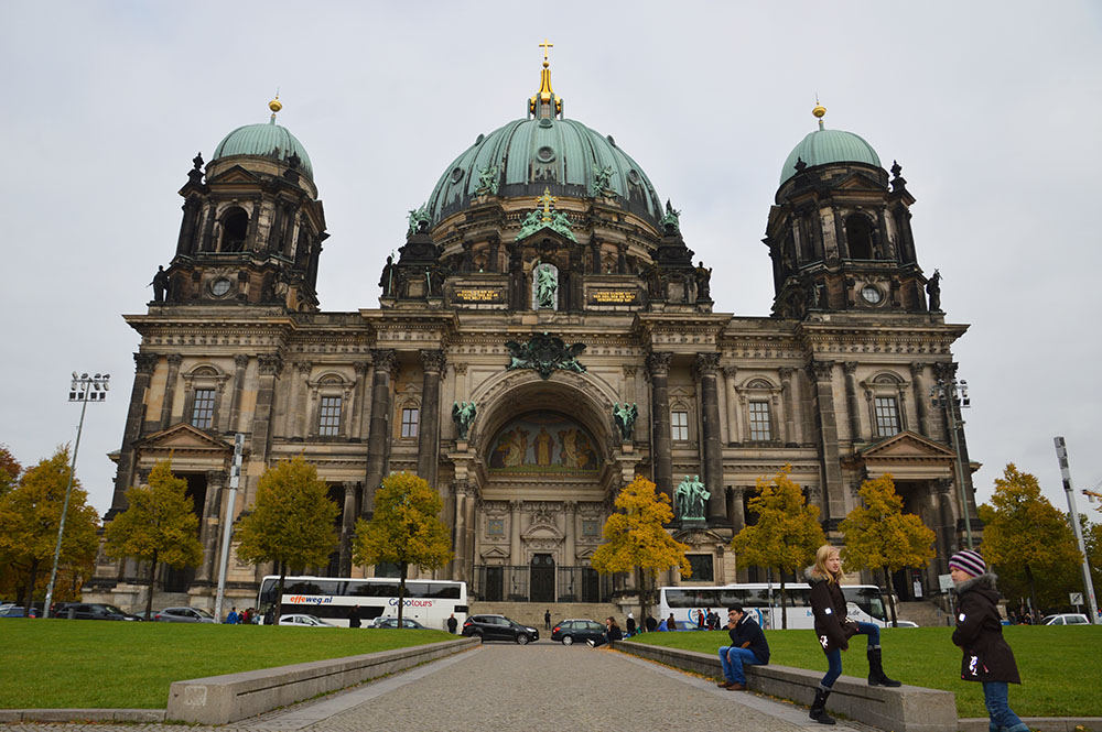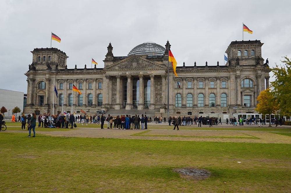 Scendiamo dal treno, mi gira un pò la testa e la gola prude. Sistemo meglio la sciarpa, lo zaino sulle mie spalle sembra ogni tappa sempre più pesante. Camminiamo spediti verso l’uscita della stazione ferroviaria, ritrovandoci dinnanzi ad un immenso spiazzo circondato da alberi autunnali. In fondo, maestoso e imponente, mentre svetta davanti il prato, il Reichstag. Non so se per via per la febbre o per una suggestione, ma la prima sensazione provata di fronte a questa costruzione è stata di…paura. Mi sono sentita immediatamente piccola, sotto quel cielo grigio che incorniciava le bandiere tedesche che sventolavano pigre…