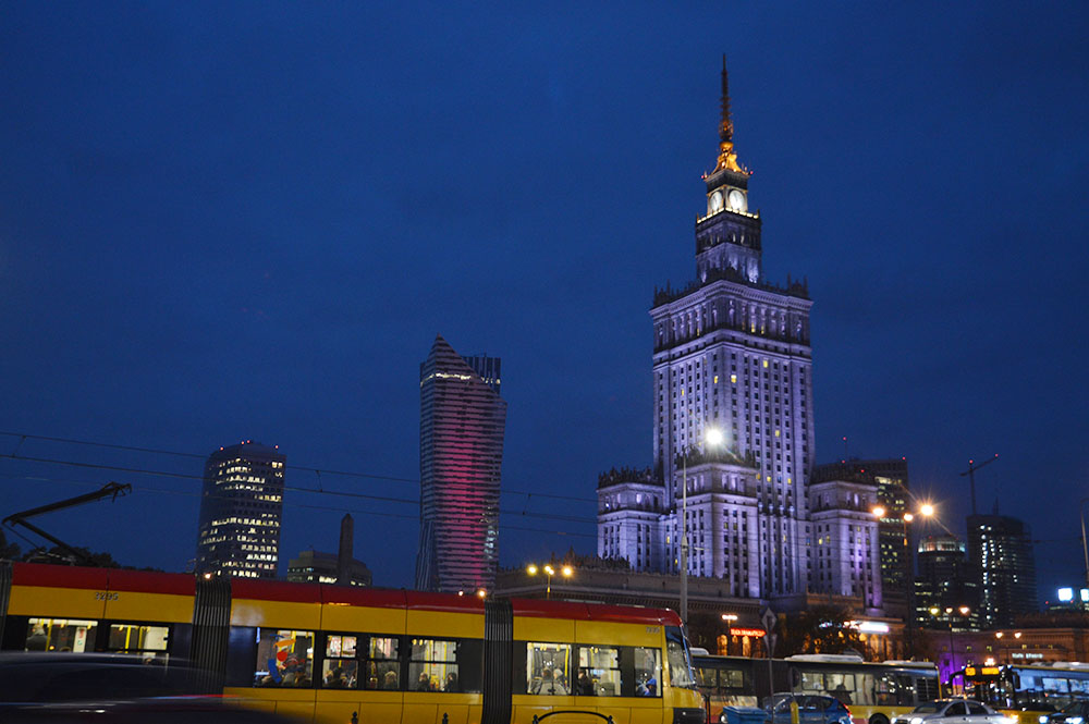 Il traguardo d’arrivo: la capitale polacca ricostruita dalle ceneri della 2° Guerra Mondiale, Varsavia, credo sia stata la più bella scoperta di questo viaggio. Lasciare la gelida Germania per la Polonia in treno, attraversando miglia e miglia di sconfinati campi dai colori autunnali, quasi i centri abitati si fossero dilatati in questi spazi. La stazione di Varsavia ci ha dato il benvenuto direttamente nel quartiere finanziario, dove svettano grattacieli degni di una metropoli europea, dominati da “Il mostro“, il Palazzo della Cultura e della Scienza donato dall’Unione Sovietica, un inquietante edificio mastodontico di stampo russo dal quale è possibile ammirare la città per soli 20zł (circa 5 euro).