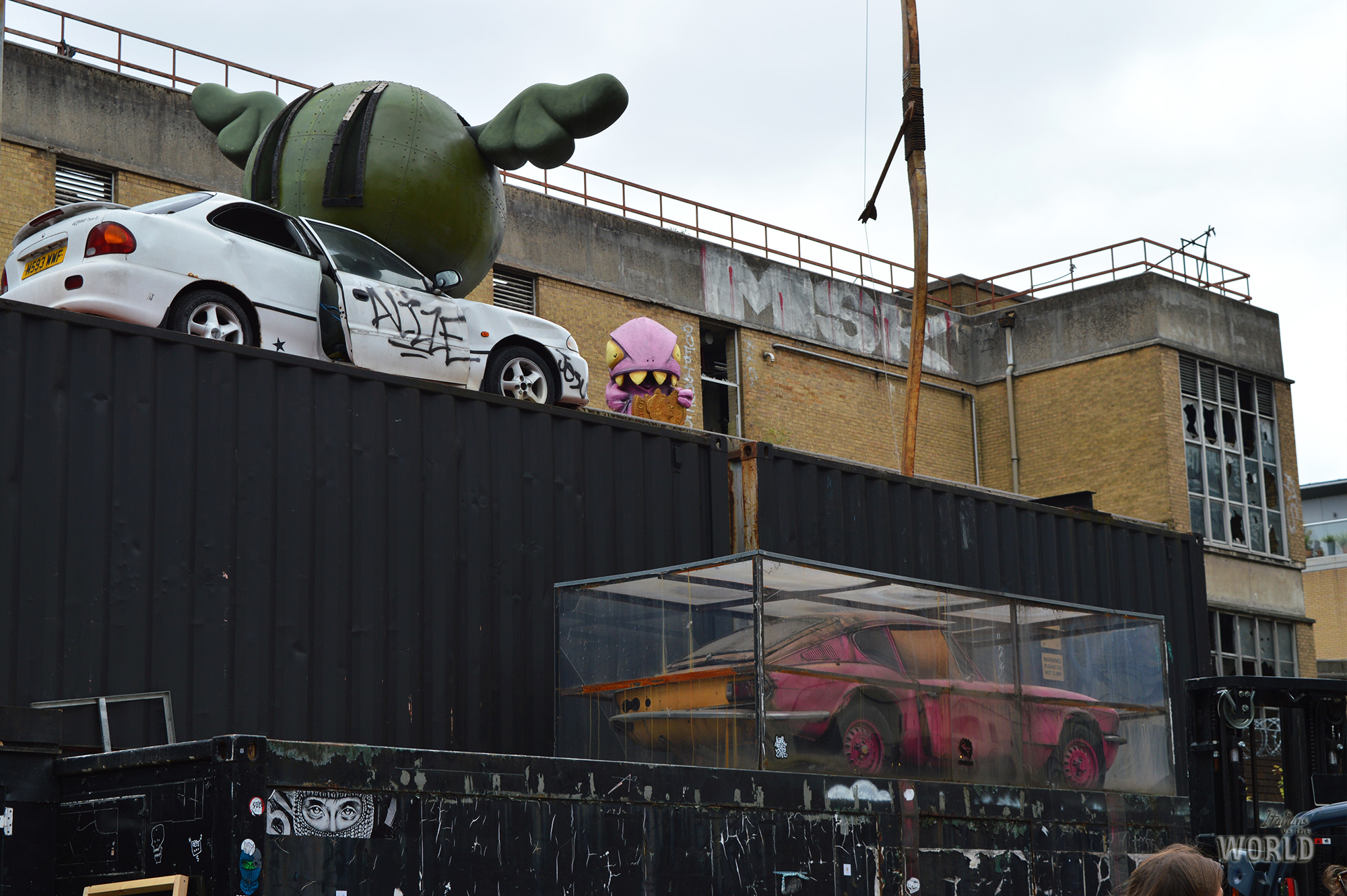 L’auto rosa è quella di Bansky, mentre quella bianca è opera di D-Face, il cui logo “schiaccia” l’istallazione (la sfera verde alata)