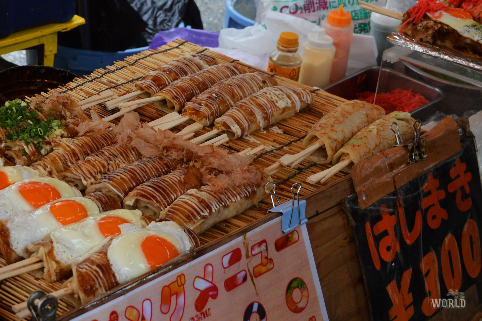 Qui trovate i vari “yaki”, ovvero tutte le pietanze saltate alla piastra, tra cui yakisoba e yakiudon, ikayaki (spiedini di calamaro) e gli yakitori (spiedini di pollo). I miei preferiti sono i famigerati Takoyaki, di cui vi ho già parlato quand’ero ad Osaka, ma che potete facilmente trovare in chioschi in diverse città Giapponesi. Il prezzo si aggira tra i 350 e i 500円, in base alla quantità di polpette di polipo che vorrete consumare nella vostra porzione. Da consumare in piedi, bollenti e con tanta salsa otafuku e katsuobushi (scaglie di tonno essiccato).