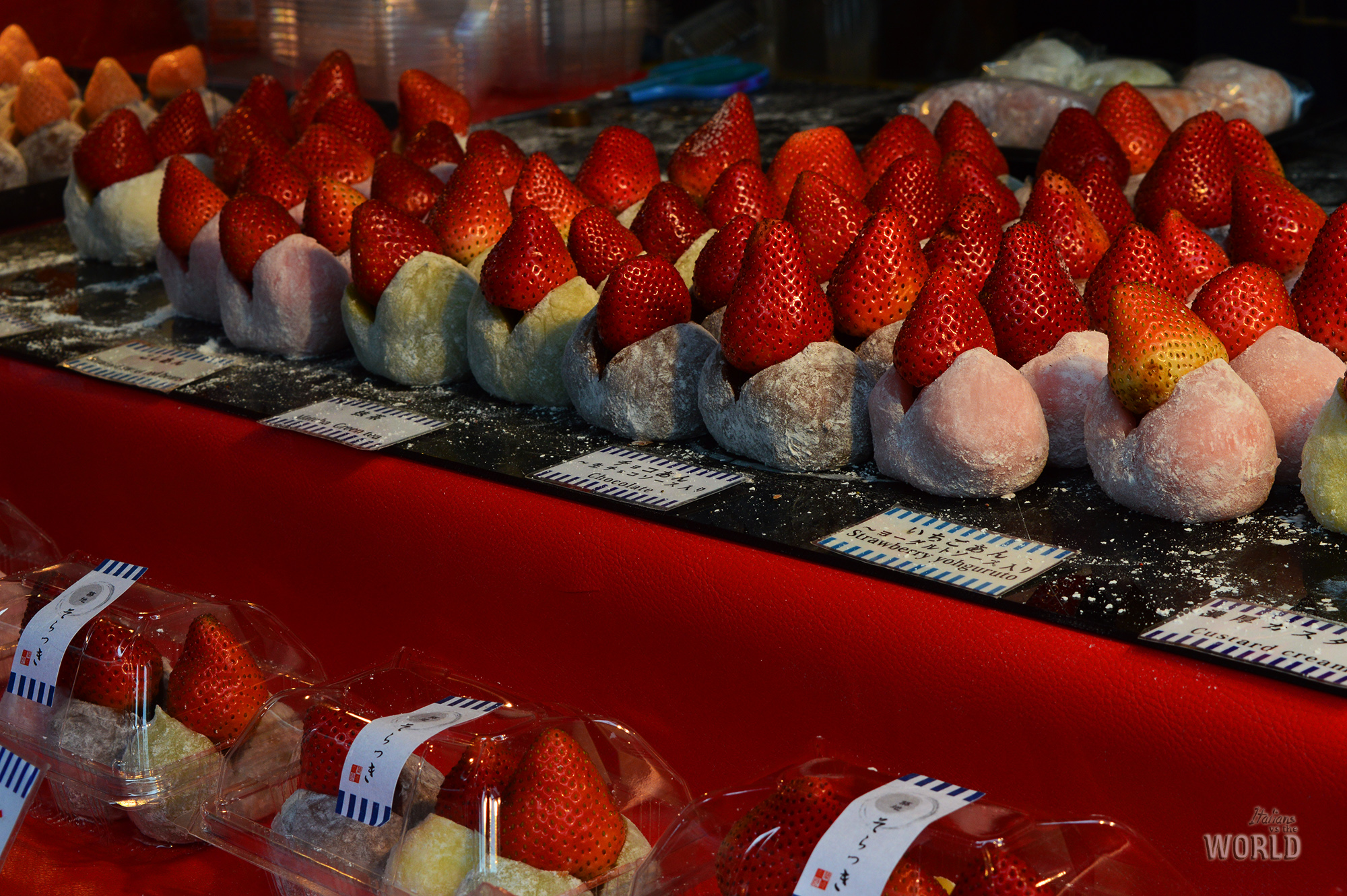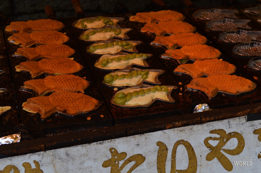 Spostandoci dall’ambito “alla piastra” ma rimanendo in quello dei mercatini, qui è possibile assaggiare alcuni dolci tradizionali giapponesi. Vi dico fin da subito di prepararvi psicologicamente al fatto che molti di essi saranno ripieni di anko, la marmellata di fagioli rossi che abbiamo (voi virtualmente probabilmente) assaggiato già in Taiwan. Uno dei più celebri è sicuramente il Tayaki, una tortina piastrata dalla forma tipica di pesce, ma onestamente glisserei per le cream cake, l’equivalente del tayaki ma di forma cilindrica, con più crema dentro e soprattutto più economiche! Potrete trovare qui anche i mochi, le tortine di riso glutinoso, e la loro versione ripiena daifuku. Da provare gli yakimochi al tè verde scaldati sulla piastra, che potrete trovare solo nei mercatini al contrario degli altri che è facile trovare anche nei supermercati.