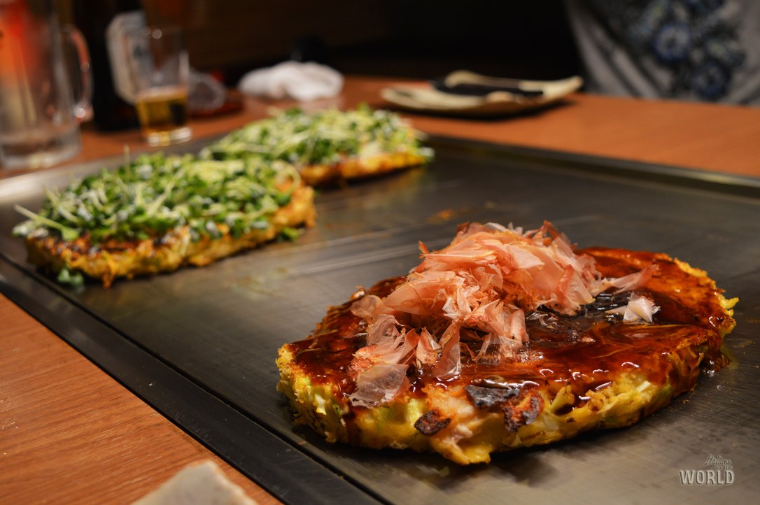 Sempre nella categoria “yaki” rientrano i deliziosi Okonomiyaki, che viene considerato l’equivalente della pizza giapponese ma che somiglia più ad una frittata di cavolo inondato di salsa otafuku, mayonese e katsuobushi! Questo pancake salato saziantissimo si aggira tra i 400 e i 900円, ed esiste in diverse versioni: la più celebre e classica è quella di Osaka, alla cui pastella si aggiunge verza, cipolla lunga e pancetta, ma ne esiste una versione inventata ad Hiroshima che contiene anche yakisoba. A Kyoto possiamo considerare in questo ambito l’Hashimaki, dalla forma di frittata infilzata in uno stecco ma dal sapore molto simile.