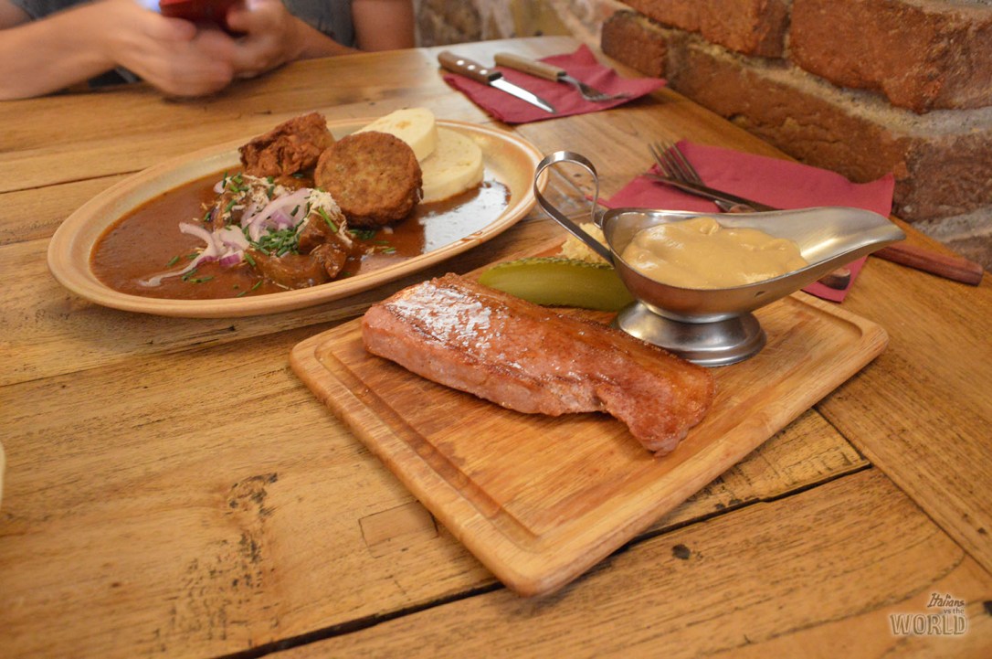 La prima cosa che ha colpito Alessio non appena messo piede a Praga sono stati i baracchini che arrostivano immensi prosciutti a fuoco vivo. L’odore di arrosto, soprattutto intorno l’ora di pranzo e soprattutto nei pressi del centro città, invade ogni vicolo facendoti venire addosso la necessità di ordinare un piattone di fette di prosciutto di Praga. Sconsigliati da più fonti di assaggiare il prosciutto dei baracchini, pena conto salato da tourist trap, siamo finiti in una meravigliosa osteria sotterranea, Krcma, affrescata come una locanda medievale, dove abbiamo potuto assaggiare il famigerato prosciutto e l’ancor più famigerato goulash.