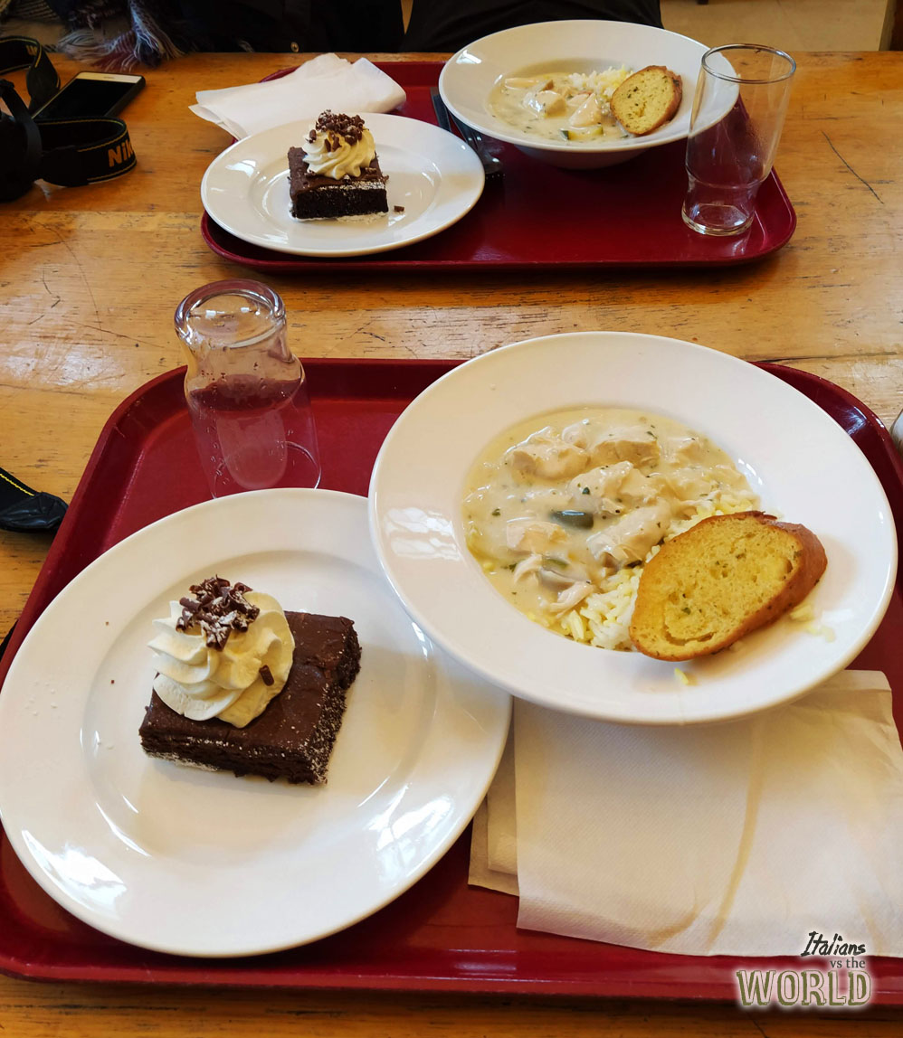 Ci siamo mescolate ai pochi studenti come due giovani Erasmus spaesate e abbiamo preso il nostro bel vassoio del menù del giorno, Chicken à la King e riso più brownies, al modico prezzo di 6,90€ (praticamente la metà del prezzo medio della zona). Acqua a volontà, cibo delizioso, sazietà assicurata e location che non ha prezzo. Se avete abbastanza faccia tosta per mettervi in coda anche voi, vi consiglio di tentare la sorte e mangiare su questi tavoli!