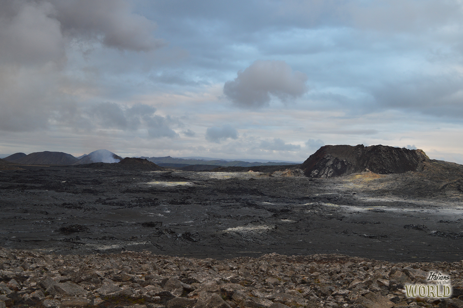 Camminare qui è decisamente impervio, si procede a rilento, il mio gruppo è in coda a tutti. Intorno a noi il sole continua a tramontare all’infinito (i tramonti islandesi sanno essere decisamente lunghi) e la terra fuma. Fuma perché il magma dell’eruzione precedente è ancora lì sotto, protetto da una crosta di pietra lavica appena formata.